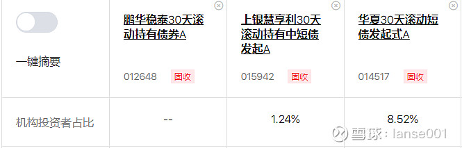 机构持有比例最高的是华夏30天的8.52%。其次是上银慧享利30天,鹏华稳泰30天没有机构持有。