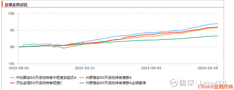 3只基金从2022.8.2到2024.3.31,涨幅第一的是中加聚安60天的6.99%,涨幅第2的是天弘安恒60天的5.96%,涨幅第3的是兴银稳安60天的5.74%,3只基金都跑赢业绩基准。(从天弘安恒60天成立的2022-08-2开始算起,为了分布比较,我统一选择中债综合财富(一年以下)指数收益率*80%+人民币活期存款利率(税后)*20%。)