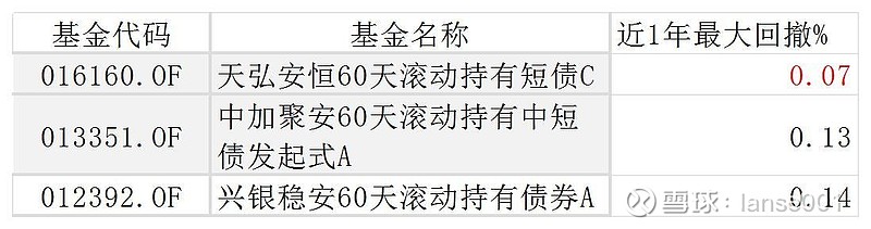 近1年最大回撤:从低到高分别为:天弘安恒60天的0.07%,中加聚安60天的0.13%,兴银稳安60天的0.14%。