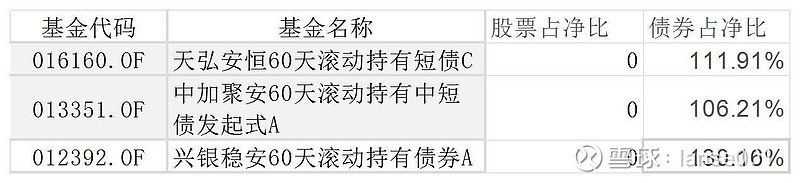3只基金都是纯债基金,不持有股票,从持有债券占净比看,兴银稳安60天的130.16%,天弘安恒60天的111.91%,.中加聚安60天的106.21%。杠杆最高的是兴银稳安60天。