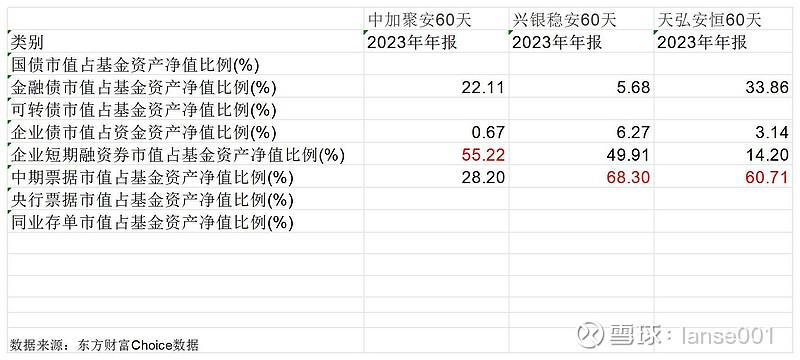 从券种配置来看:中期票据、企业短期融资券、金融债是天弘安恒60天和中加聚安60天前3大持仓,但各个基金的持仓有一定的差异,中期票据、企业债、金融债是兴银稳安60天和中加聚安60天前3大持仓,天弘安恒60天和兴银稳安60天第一大持仓是金融债,中加聚安60天第一大持仓是企业短期融资券。(3只基金都是纯债基金,不持有可转债。)