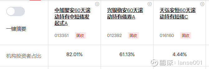机构持有比例最高的是中加聚安60天的82.01%。其次是兴银稳安60天的61.13%,天弘安恒60天的4.44%