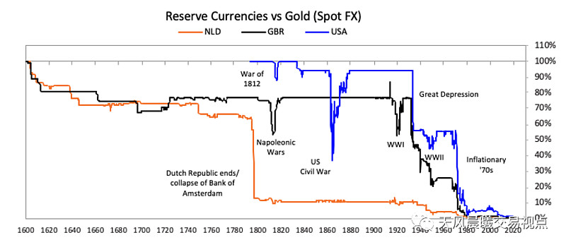 通常导致一个国家失去储备货币地位的因素:1)一个正在崛起的竞争对手使其丧失了已经确立的经济和政治主导地位,造成其脆弱性(例如,荷兰落后于英国或英国落后于美国),2)庞大且不断增长的债务,最终通过央行印钞和购买政府债券以债务货币化方式解决,导致3)贬值成为一种自我强化的趋势,并且这种趋势无法阻止,因为财政和国际收支赤字太大,削减开支的措施无法奏效。