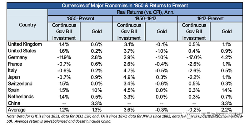 1912年(现代法定货币时代)以来,持有短期国债的实际回报率(经过通胀调整的)为-0.2%,持有黄金的实际回报率为2.2%。在此期间,你只有在大约一半的国家持有生息现金货币才能获得正的实际回报,在其余的国家则会遭受损失(在法国、意大利和日本,每年损失超过2%,在德国,由于恶性通货膨胀,每年损失超过15%)。