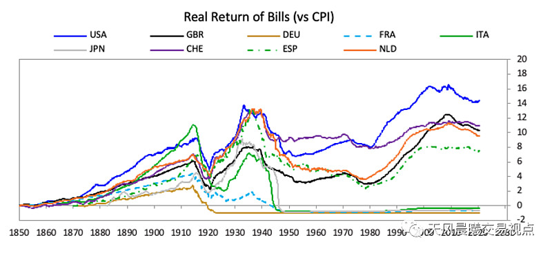 自1850年以来,在大约一半的国家里,持有短期国债会得到正的实际回报,另一半会得到负的实际回报,在德国这样的国家里,你会被彻底消灭两次。