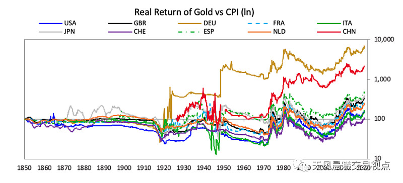 下一个图表显示了从1850年到现在持有黄金的实际回报。如图所示,从1850年到1971年黄金的回报(通过升值)与通货膨胀造成的损失相当,除了德国。当然,像之前描述的那样,在平均值附近是有很大的变化的(例如,直至20世纪30年代的货币贬值,以及第二次世界大战结束后的货币贬值,这次货币贬值导致1944年布雷顿森林货币体系诞生)。直到1971年,黄金价格一直保持稳定,而货币和信贷却在扩张。然后在1971年,货币贬值,与黄金脱钩,因此出现了从第二类货币体系(例如,由黄金支持的纸币)到法定货币体系的转变。这种货币与黄金脱钩、转向法定货币体系的做法,赋予了各国央行不受约束地创造货币和信贷的能力。这导致了高通胀和低实际利率,实际黄金价格大幅攀升。直到1980年至1981年,当时的名义利率明显高于通胀率,导致货币走强和黄金下跌,一直延续到2000年。之后,央行让名义利率低于通胀率,而当它们无法通过正常手段将利率进一步压低时,就会印钞并购买金融资产,这对金价形成了支撑。