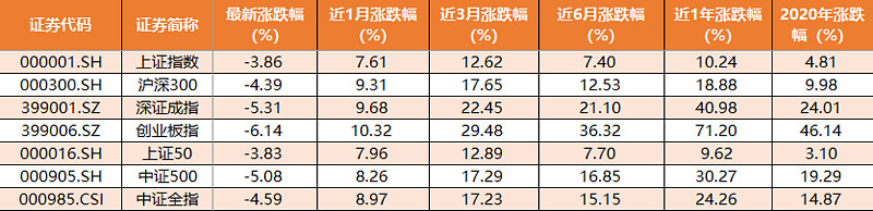 据Wind数据,截至收盘,上证综指跌3.86%,报3196.77点;深证成指跌5.31%,报12935.70点;创业板指跌6.14%,报2627.84点。