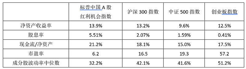 综合上述三点,红利类产品理论上具有盈利能力较强、盈利稳定性较好、估值偏低、波动较小的典型特征。用A股历史数据检验2007年以来各期高股息组合的资产特征,结果显示红利策略所选出的股票不论从当期的基本面还是下一财年的基本面来看,在净资产收益率、现金销售比以及估值方面,都表现出显著且稳定的优势。以华宝红利基金所跟踪的标普中国A股红利机会指数最新成分股截至2022年1月31日的基本面数据为例,展示了其成分股的净资产收益率、现金流比净资产、市盈率以及波动率与沪深300指数、中证500指数、创业板指数的对比情况。结果上,标普中国A股红利机会指数在各个比较维度上都表现出显著的优势:其拥有最高的净资产收益率,最高的股息率、最好的现金流以及最低的市盈率和最低的成分股波动率。具体数据如下表所示: