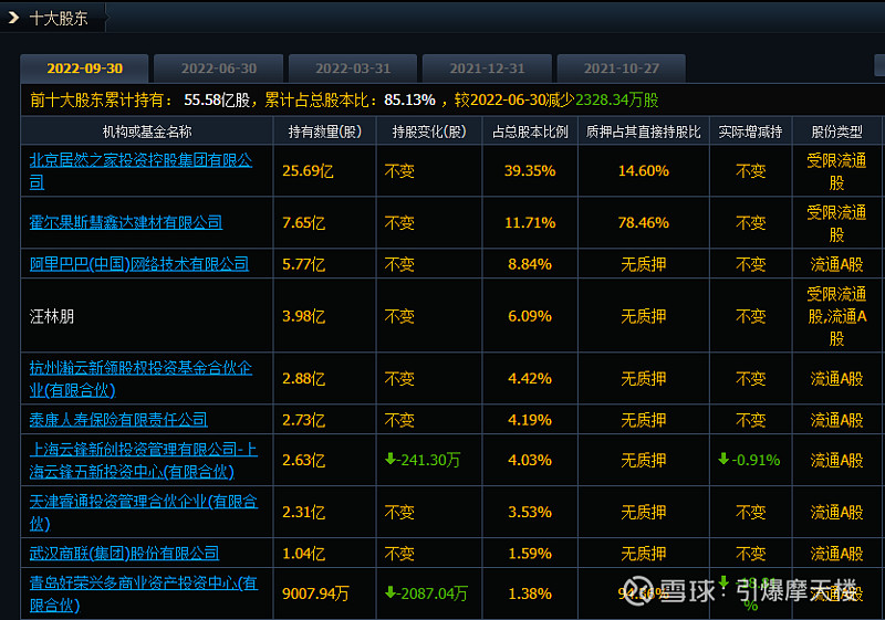 2022年三季报显示居然之家十大股东占比85.13%
