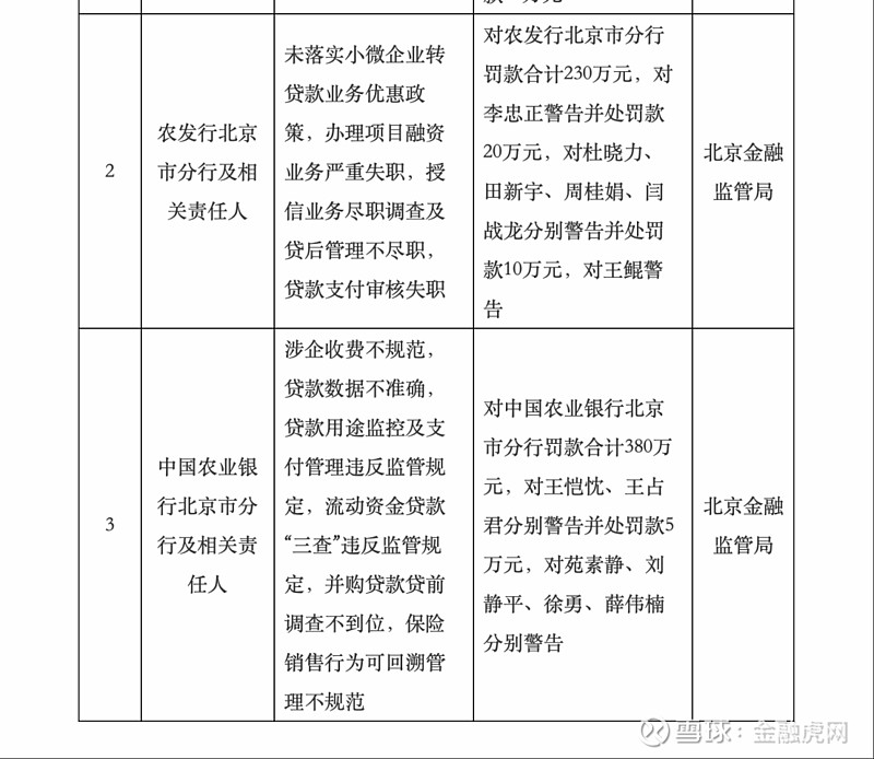 与此同时,国家金融监督管理总局北京监管局也公布了对农发行北京市分行和中国农业银行北京市分行的处罚决定。农发行北京市分行被指出未落实小微企业转贷款业务优惠政策,办理项目融资业务严重失职,授信业务尽职调查及贷后管理不尽职,贷款支付审核失职等问题。