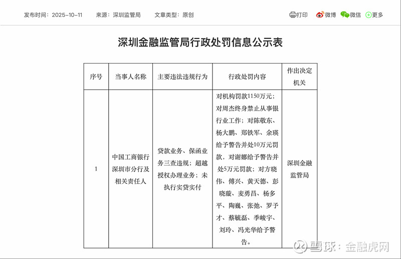 深圳金融监管局公示的信息显示,中国工商银行深圳市分行存在诸多违规行为,包括贷款业务、保函业务“三查”违规,超越授权办理业务以及未执行实贷实付等问题。针对这些违规行为,监管部门对工商银行深圳市分行处以1150万元的罚款。