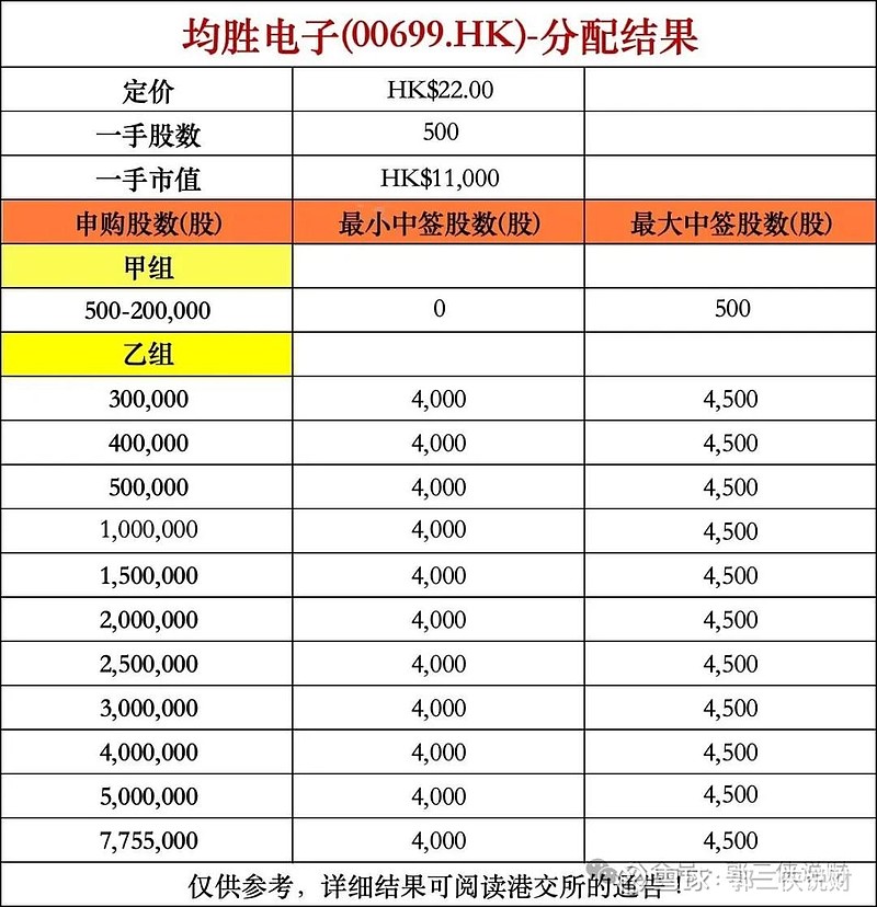 均胜电子以招股价22~23.6港元的下限定价,一手市值11000港元。甲组全员抽签,而乙组所有档位则统一分配8~9手,这个分配方式十分少见,对乙头最有利。顶头槌要骂娘了,用1850万申购和人家用72万申购,中签手数是一样的,这个机会成本太大了。