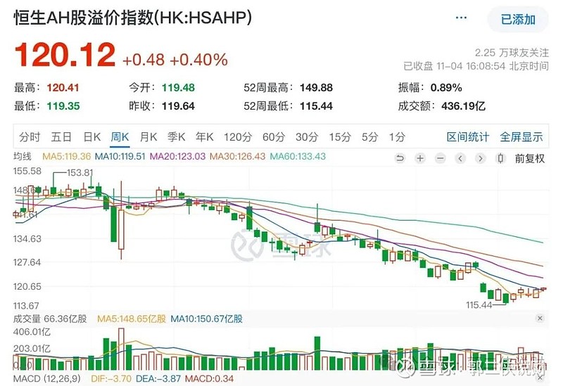 由于港股市场流动性没有A股好,港股相对于A股普遍存在折价现象。当前,恒生AH股溢价率指数为120,这意味着A股整体比港股贵了20%。