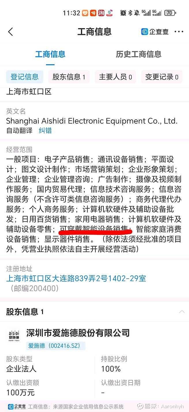 企查查APP显示,近日,上海爱施迪电子器材有限公司成立,法定代表人为吴磊,注册资本100万元,经营范围包含:计算机软硬件及辅助设备零售;可穿戴智能设备销售;智能家庭消费设备销售;显示器件销售等。企查查股权穿透显示,该公司由爱施德全资持股。$爱施德(SZ002416)$ $天音控股(SZ000829)$