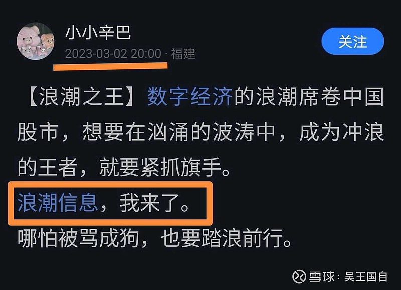 再浏览一下,发现今天晚上八点发了一个很短的帖子,主要宗旨就是推荐热门概念数字经济中的浪潮信息,再看浪潮信息已经涨幅巨大,高高在上了。这种大V在我眼里别说粉丝六十多万,即使是粉丝六千多万那也是专坑散户的,不是蠢就是坏。有本事有道德的大V应该是挖掘个股的底部,而不是推荐个股的顶部![]()
