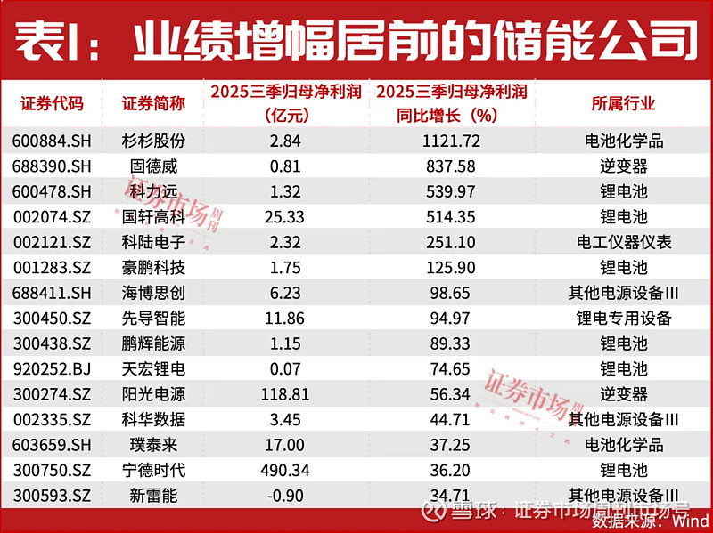 如杉杉股份,公司是偏光片和负极材料“双主业、双驱动”发展格局,在负极材料业务销量较大幅度增长等背景下,公司今年前三季度实现归母净利润2.84亿元,同比增长1121.72%,在所有储能公司中业绩增速最快,而其也成了A股市场中为数不多的业绩增速超十倍的公司。
