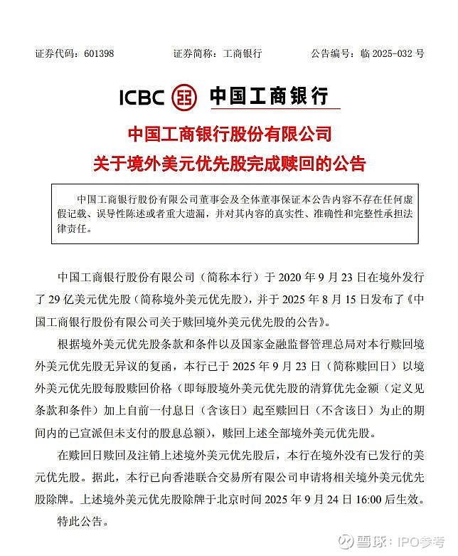 @今日话题 【工商银行:29亿美元境外美元优先股完成赎回】工商银行9月24日晚间公告,本行于2020年9月23日在境外发行了29亿美元优先股。根据境外美元优先股条款和条件以及国家金融监督管理总局对本行赎回境外美元优先股无异议的复函,本行已于2025年9月23日以境外美元优先股每股赎回价格,赎回上述全部境外美元优先股。在赎回日赎回及注销上述境外美元优先股后,本行在境外没有已发行的美元优先股。据此,本行已向香港联交所申请将相关境外美元优先股除牌。上述境外美元优先股除牌于北京时间2025年9月24日16:00后生效。