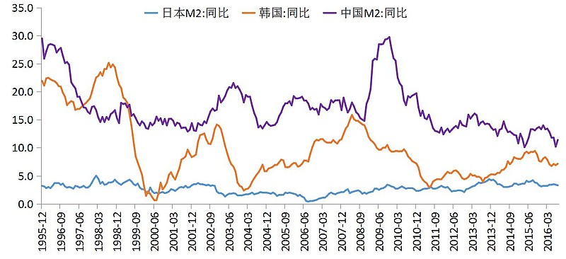 而从货币发行角度来看,中国M2从1995年至今一直处于高速增长状态。数据显示,号称实行无限量宽政策的日本,实际货币超发量也远远低于我国。