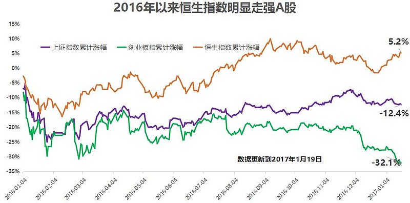 如上图所示,2016年至今创业板跌幅超过32%,上证指数下跌12.4%,港股则上涨了5%。加上汇率变动带来的相对收益,整体而言港股投资收益最佳。