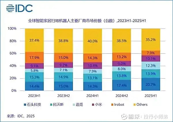 【据IT之家报道称】据国际数据公司 (IDC) 最新发布的《全球智能家居清洁机器人设备市场季度跟踪报告,2025 年第二季度》显示,石头科技以 15.2% 的市场份额领跑全球清洁机器人市场, 并在核心的扫地机器人品类中以 20.7% 的份额稳居全球第一。