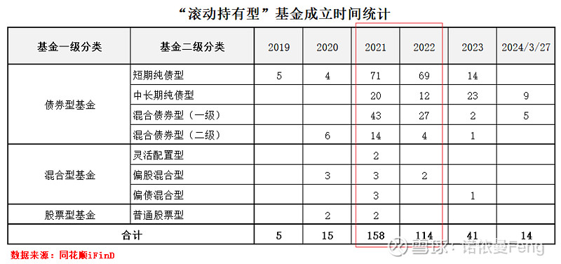 3、滚动持有型基金成立高峰期在2021、2022年