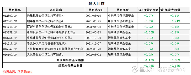 5、由于“滚动持有”对短期纯债基金的收益增厚作用,中加聚安60天滚动持有、中信建投稳益90天滚动持有、上银慧享利60天滚动持有、天弘安恒60天滚动持有的近1年收益率均高于同期中长期纯债基金指数,而最大回撤却小于中长期纯债;