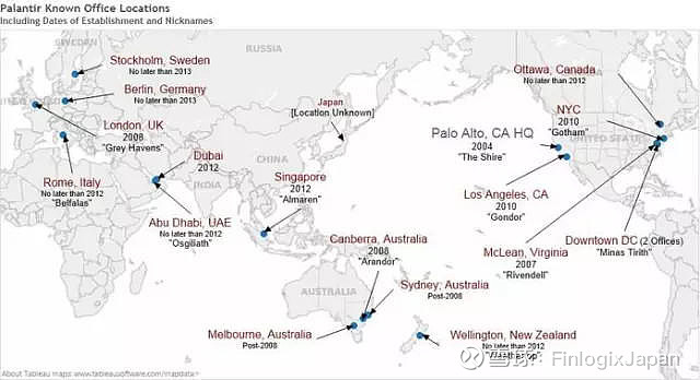 Palantir 来源于《指环王》中一块能远视到未来的魔石,公司以小说中出现的许多地理位置作为各地的办事处。公司最重要的两个数据分析平台 Palantir Gotham 和 Palantir Metropolis都来自 DC 漫画(蝙蝠侠和超人)。