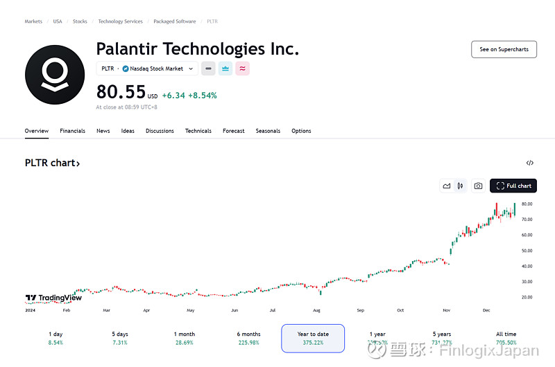 截至东京时间2024年12月21日,Palantir YTD收益已翻3.75倍