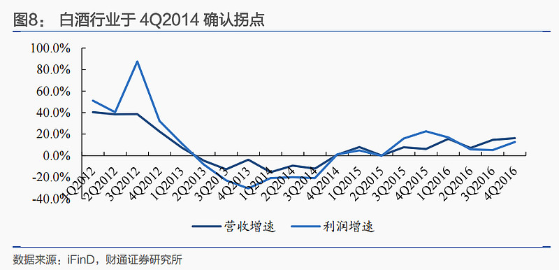 分季度来看,1Q2013企业仍有预收账款进行调节,2Q2013-3Q2014 SW白酒行业收入和利润同比处于下滑态势,政策影响效果显现。经历近2年的调整后,4Q2014白酒行业收入及利润增速重回正增长,确认行业拐点。