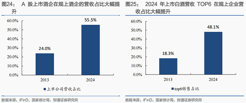 TOP6酒企收入占比大幅提升,强化行业自律。2014年后白酒呈现挤压式增长,行业集中度快速提升,上市酒企营收占比从2013年的24.0%提升至2024年的55.5%。上市酒企以极高的占有率及产品结构主导行业发展。如果仅以2024年销售额TOP6上市酒企营收来看,2013年至2024年其营收占比亦从18.3%提升到48.1%,可见TOP6企业以超越行业的速度快速增长,且已经开始主导行业发展。
