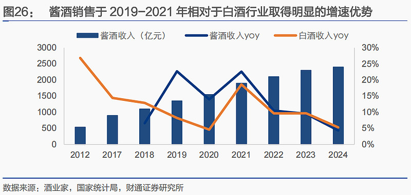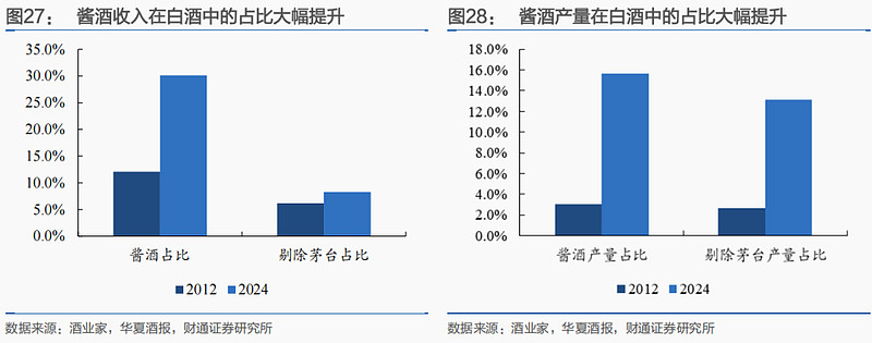 从酱酒的占比来看,2012-2024年酱酒收入占比从12.1%增长至30.1%;酱酒产量从40万吨提升至65万吨,产量占比从3.5%提升至15.7%。剔除贵州茅台看,酱酒收入占比从6.2%提升至8.3%,而酱酒产量占比从3.1%提升至13.2%。由于酱酒的生产工艺需要5年周期,故非贵州茅台类酱酒仍有巨大的产量潜力有待释放,这也将成为未来明确的酒企机遇。