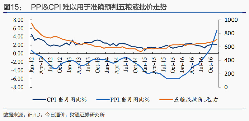 在宏观指标中,PPI和CPI是表征价格变化及经济的重要指标,那么其对于白酒批价是否具有领先效应?选取五粮液批价进行观察,发现PPI和五粮液批价在一段时间出现了背离。从白酒板块的业绩来看,4Q2014开始回升,与PPI亦有明显不同。至于CPI,亦难以看出明显的相关关系,而且酒价作为CPI的组成部分,难以直接比较讨论。考虑到批价对供需的反应灵敏,在该阶段短期内以宏观经济指标来作为行业景气判断依据可能效果一般。
