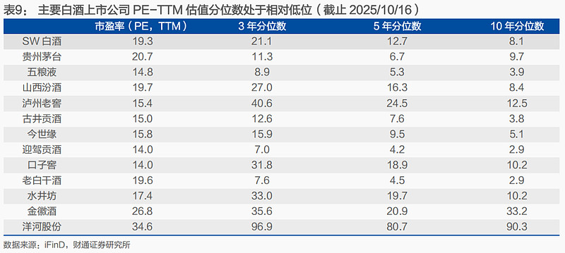 虽然PE-TTM估值在投资决策中不能作为充分条件,但却是取得良好回报的必要条件之一。从白酒公司目前的估值水平来看,当前无论是从3年-5年-10年分位数来看,都处于较低的水平,这有望在白酒产业回暖后为投资者提供巨大的回报。