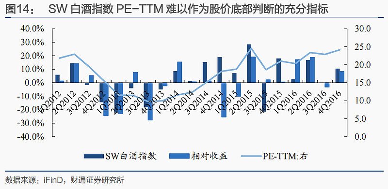 我们认为白酒的PE-TTM估值仅仅是股价及业绩表现的结果,尤其在业绩大幅波动的阶段,难以作为投资决策的核心依据。回顾调整期间的估值表现,即使在PE-TTM较低的阶段,股价依然有大幅下跌且跑输沪深300的阶段,如在2013年Q2,SW白酒指数PE-TTM仅为11.5倍,但3Q2013白酒指数再次下跌18.2%,相对沪深300仍然跑输27.6pcts。但在2Q2015期间,白酒指数首次大幅跑赢沪深300指数19pcts,其前一季度1Q2015的PE-TTM则达到18.8倍。