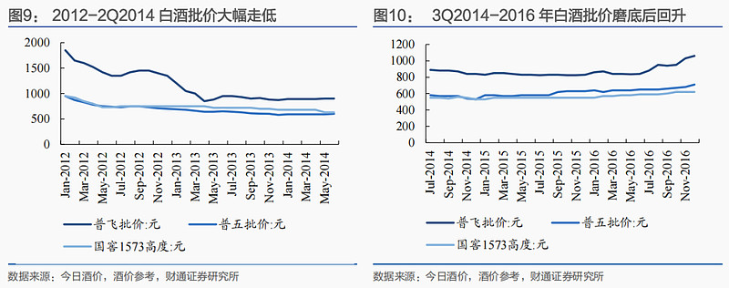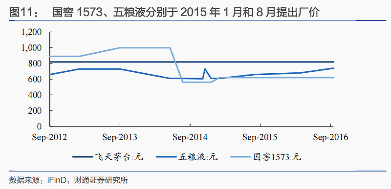 在2013-2016年的调整期间,贵州茅台价格政策是维持出厂价不变;五粮液则进行了多次出厂价调整,其中2014年12月的降价有力降低了渠道资金压力,并在确认行业重回上行周期后,于2015年8月进行提价;国窖1573的出厂价亦有升降,在2014年7月调降到560元之后维持到2015年1月底,并进行提价,与公司去库存的果断措施及效果有关。