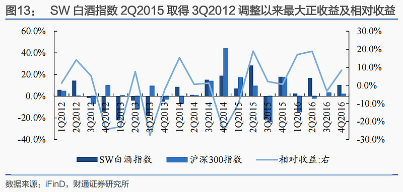 拆分到季度来看,白酒指数在3Q2012 -4Q2013期间持续下跌,2014年Q1开始实现正收益,当季度的收入降幅为2Q2013至3Q2014期间季度最大。