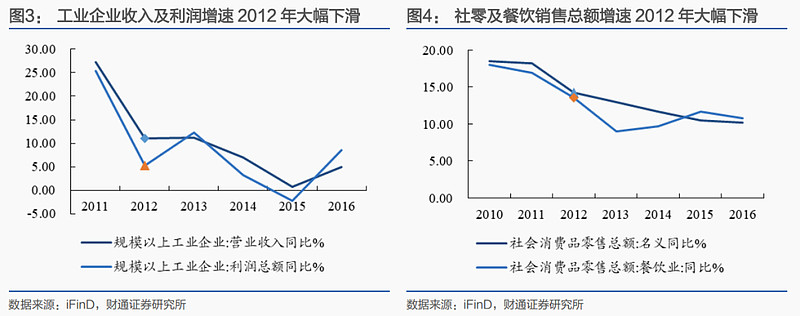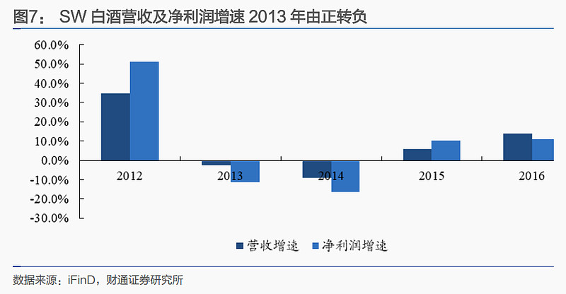 2013年白酒行业出现深度调整,SW白酒营收增速从2012年的34.9%转为下跌2.7%,净利润增速从51%转为下跌11%。2014年行业降幅进一步扩大,营收下降9%,净利润下降17%,其中不仅有2013年三公消费限制冲击的余波,还有2014年经济增速下滑带来的影响。2015年,白酒行业收入利润重回正增长,领先宏观经济复苏。另外2013年宏观经济相对稳健,GDP同比增速仅较上年下滑0.1pct,房地产开发投资增速提升3.6pcts,工业企业利润总额增速提升6.9pcts,但社零增速小幅下滑1.29pcts。2014年经济增速下滑,房地产开发投资增速下降9.3pcts,并于2015年进一步下滑9.5pcts之后于2016年反弹;2014年工业企业利润增速下降8.9pcts,并于2015年进一步下降5.6pcts转为负增长,其后于2016年反弹。