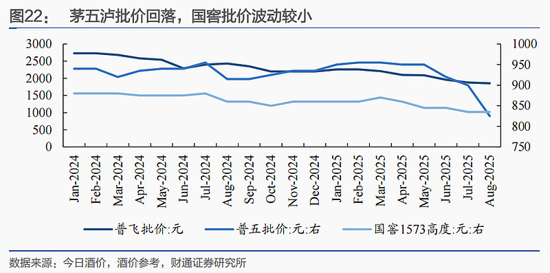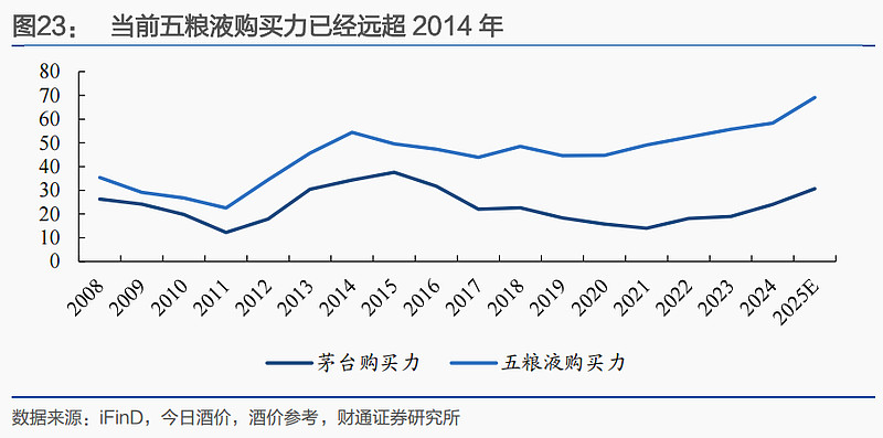 假设以城镇人均可支配收入(假设2025年增长幅度和2024年同)除以批价来表征居民对白酒的实际购买力,则可看到当前五粮液的购买力为69,已经大幅超过2014年的54;飞天茅台购买力为31,仍然低于2014年的34,从2014年调整的节奏来看,飞天茅台批价的底部比五粮液来的稍晚。
