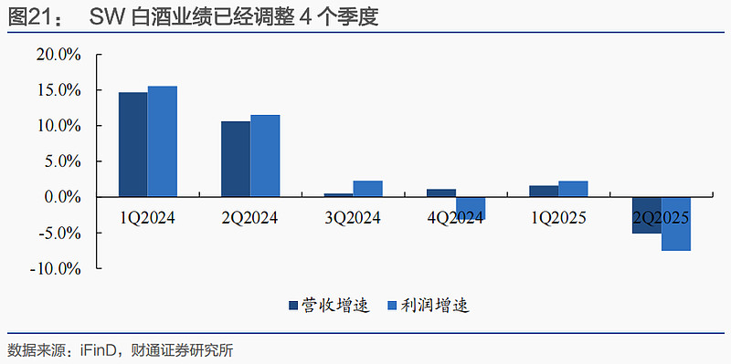 从SW白酒板块业绩看,3Q2024板块开始明显降速,4Q2024板块利润近年首次同比下滑,2Q2025板块收入及利润分别同比下滑5.1%、下滑7.5%,预计3Q2025依然处于下滑状态。从调整节奏上看,2013年三公消费限制后行业调整从1Q2013开始至4Q2014历时8个季度;本次从3Q2024开始调整,已经历时5个季度,本轮调整我们预计行业将于2Q2026前后触底。从调整的程度看,由于本轮主要是商务需求的缓慢回落,所以白酒板块收入和利润的调整幅度将明显小于2013-2014年。