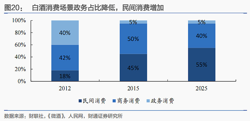 2012年是宏观经济超预期降温的年份,标志着中国经济进入“换挡期”,经济增长面临“三期叠加”的压力,GDP增速超预期下降,全年GDP增速7.9%,跌破8%关口。拆分看,房地产开发投资同比增速达到16.2%,较上年回落11.7pcts,商品房销售额同比增长10%,较上年回落2.1pcts;全年规模以上工业企业利润总额同比增速5.3%,增速较上年大幅下降20.1pcts,营收同比增速11.04%,增速较上年大幅下降16.19pcts;社会消费品零售总额名义同比增速14.3%,增速比上年下降3.93pcts,社零餐饮业同比增速13.6%,增速比上年下降3. 3pcts。从白酒消费场景看,2012年商务需求占比40%,个人占比18%,政务占比42%。宏观经济降温冲击商务场景需求,期间勾兑门、塑化剂舆论影响亦较大,行业已经有调整的内在压力。