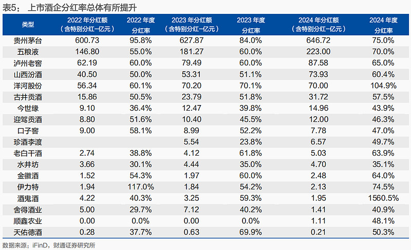 酒企提升分红率,部分宣布三年期分红规划。分红作为增加投资者回报的有力手段,越来越得到酒企的重视,尤其是近几年白酒股价持续低迷,估值走低,酒企的股息率不断提升,吸引稳健型投资者的关注。2024年度分红率超过50%的酒企有11家,分红率超过100%有2家酒企,分红额度实现正增长和分红率同比明显提升的酒企有12家,超过半数。与此同时,贵州茅台、五粮液、泸州老窖、洋河股份均公告了2024年度-2026年度分红计划。