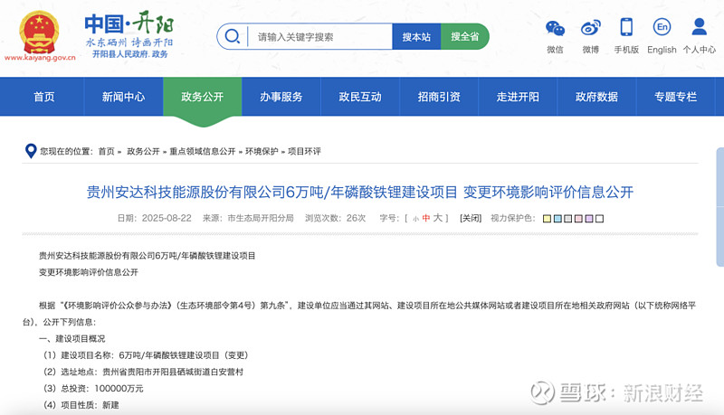近日,贵阳市生态局开阳分局就“贵州安达科技能源股份有限公司6万吨/年磷酸铁锂建设项目”环评变更环境影响评价进行信息公开。