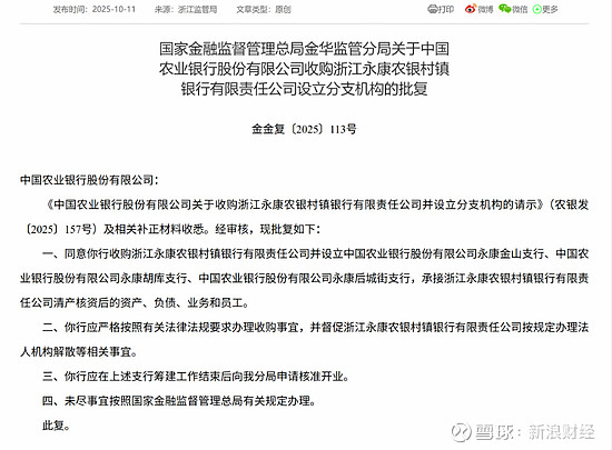 批复明确,同意农业银行收购浙江永康农银村镇银行并设立中国农业银行永康金山支行、中国农业银行永康胡库支行、中国农业银行永康后城街支行,承接浙江永康农银村镇银行清产核资后的资产、负债、业务和员工。