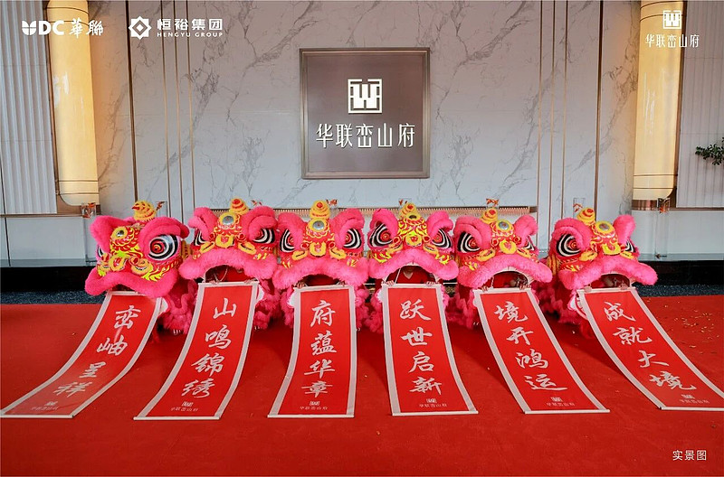 醒狮点睛与采青环节将现场氛围推向高潮,灵动的醒狮跃动生风,领导们执笔点睛,寓意“点石成金、吉祥如意”,象征着项目未来发展势如破竹,赢得阵阵掌声。紧接着,领导与嘉宾共同移步剪彩区,伴随着漫天金花,华联峦山府展示中心正式开门迎客。