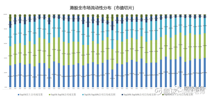 2020年初,富途研究拉的一组有趣的数据,过去10年,港股的流动性持续的像头部集中,以市值切片,统计各个市值组别的流动性情况,前1%成交占比40%+,1-5%占比30%+,5-20%占比20%+,剩下的80%的股票成交占比只不到5%...