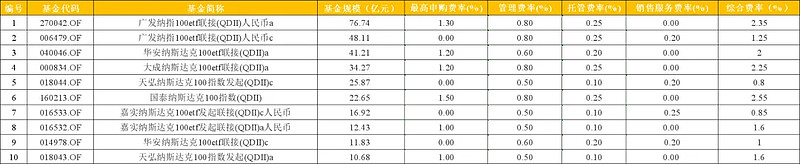 从综合费率上来看。天弘纳斯达克100指数发起(QDII)C(018044)最佳,综合费率只有0.8%,当然这个基金目前每日限购100元,对于资金量大的朋友不友好。