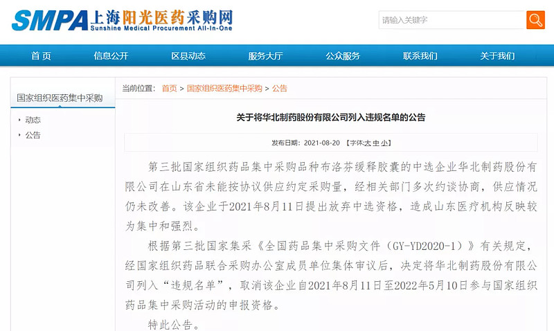 8月20日,上海市阳光采购网发布公告称,经国家组织药品联合采购办公室成员单位集体审议后,决定将华北制药股份有限公司列入“违规名单”,取消该企业自2021年8月11日至2022年5月10日参与国家组织药品集中采购活动的申报资格。