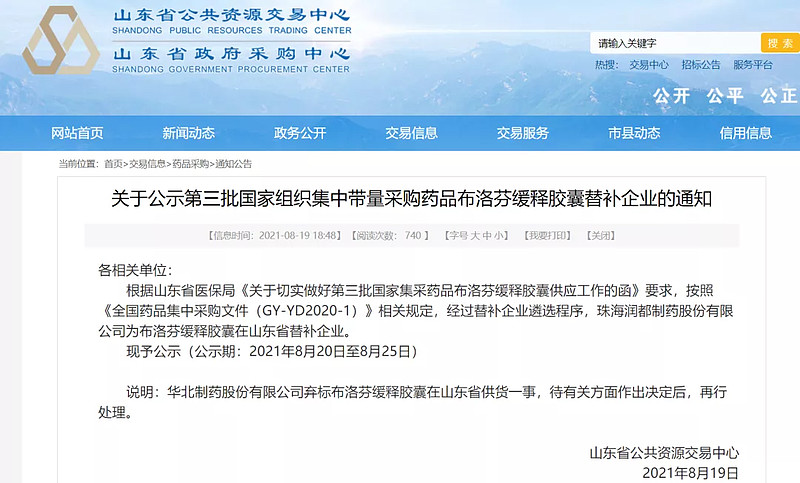 8月19日,山东省政府采购中心发布公告称:珠海润都制药股份有限公司成为布洛芬缓释胶囊在山东省集采的替补企业。