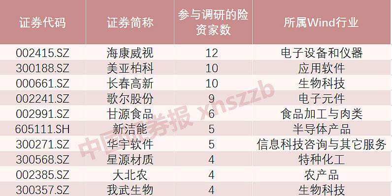 四季度以来,海康威视被12家险资调研,排名第一;并列排名第二是美亚柏科和长春高新,均有10家险资参与调研。另外,歌尔股份、甘源食品、新洁能、华宇软件也有5家以上险资组团调研。
