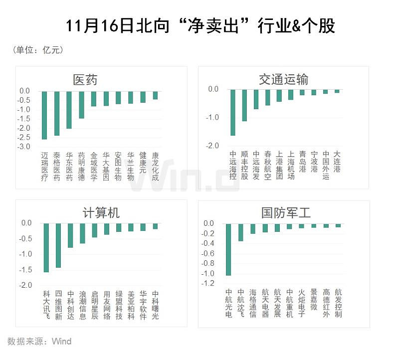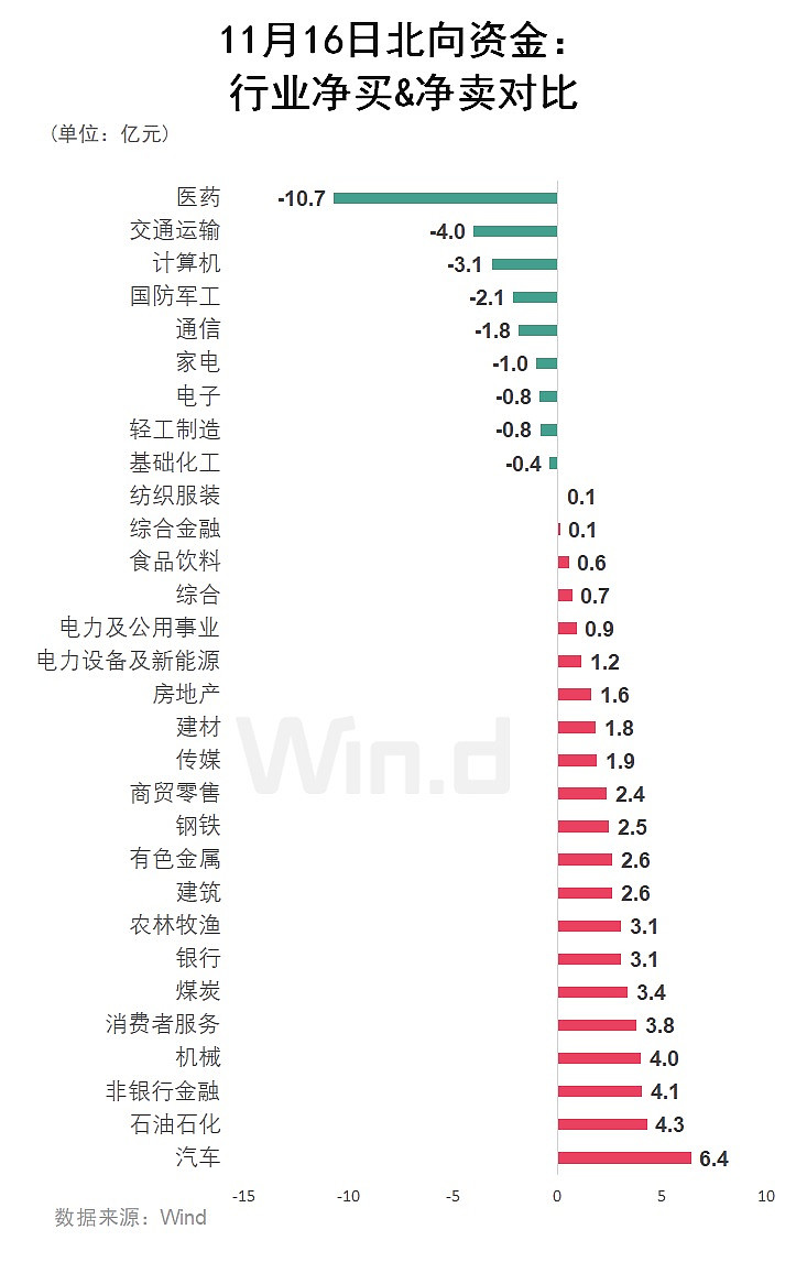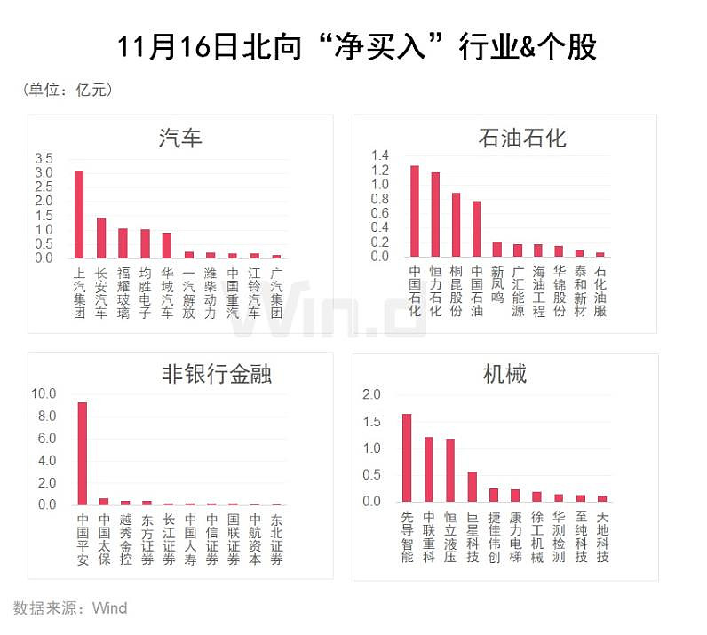 Wind通过统计分析发现,从行业角度来观察,11月16日,北向资金净买入金额排名靠前的行业有汽车、石油石化、非银行金融、机械、消费者服务;净卖出行业靠前的有:医药、交通运输、计算机、国防军工、通信。